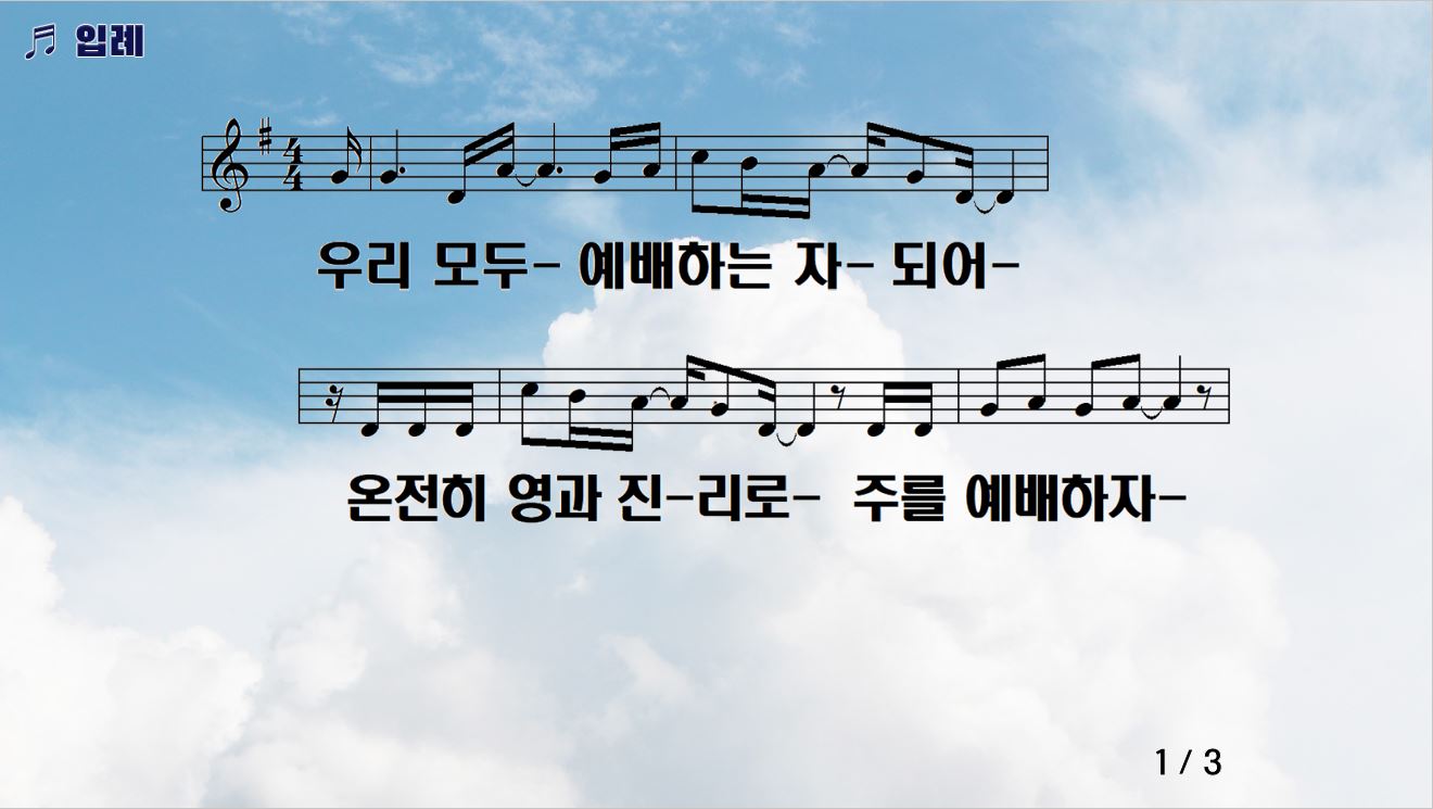 입례 (우리 모두 예배하는 자 되어) 우리 모두 예배하는 자 되어 온전히 영과 진리로 주를 예배하자 주가 우리와 함께 영원히 함께 하시고 마르지 않는 샘물로 우릴 채우시리라 |